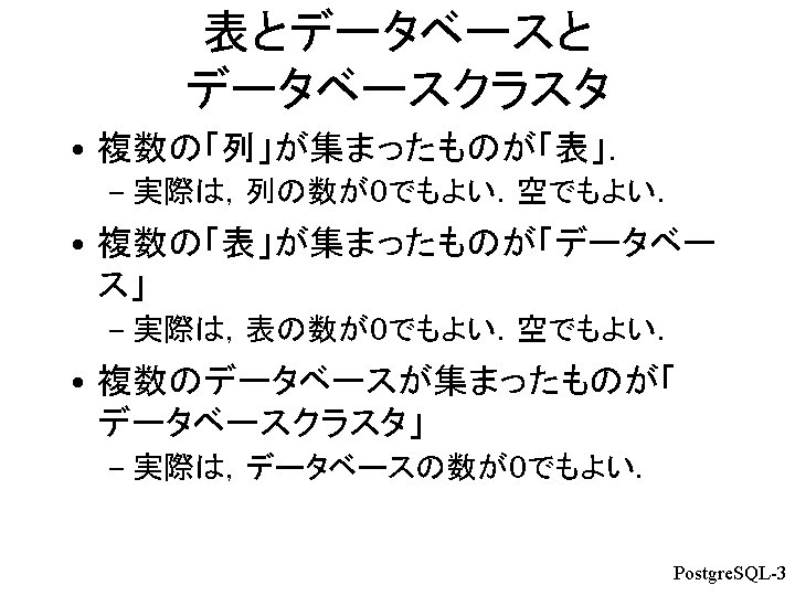 操作 6/22 • 表usertblを作る(データベース接続中) . ct 13140 db=> CREATE TABLE usertbl ( ct 13140 db(> id integer, ct 13140 db(> name varchar(100), ct 13140 db(> email varchar(100) ct 13140 db(> ); このように CREATE TABLE 表示されれば成功. ct 13140 db=> 使用したSQL文は CREATE TABLE usertbl (id integer, name varchar(100), email varchar(100)); 途中の改行はあってもなくてもよい. 最後の;(セミコロン)を忘れない様に. Postgre. SQL-22