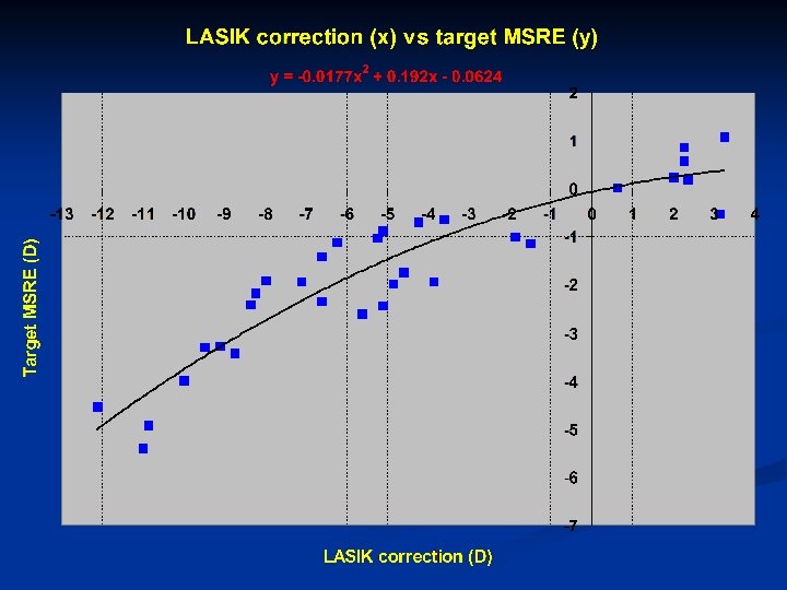 Post-LASIK IOL Power Adjustment Nomogram LASIK correction (D) -12 -11 -10 -9 -8 -7 -6 -5 -4 -3 -2 -1 1 2 3 4 target MSRE (D) -4. 9 -4. 3 -3. 8 -3. 2 -2. 7 -2. 3 -1. 9 -1. 5 -1. 1 -0. 8 -0. 5 -0. 3 0. 1 0. 3 0. 4 0. 5 Target error (D) for emmetropia= -0. 0177(L)^2+0. 192(L)-0. 0624 L=LASIK correction (D)