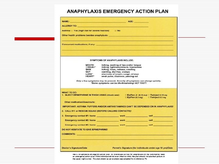 Wyposażenie gabinetu do immunoterapii o o o o o Stetoskop i sfigmomanometr Igły i strzykawki różnej wielkości Adrenalina 1 : 1000 Tlen i aparat AMBU Płyny do dożylnego podania Antyhistaminiki (p. o. i i. v. ) Glikokortykosteroidy (i. v. ) Zacisk naczyniowy Ew. laryngoskop, kardiowerter, zestaw do tracheostomii