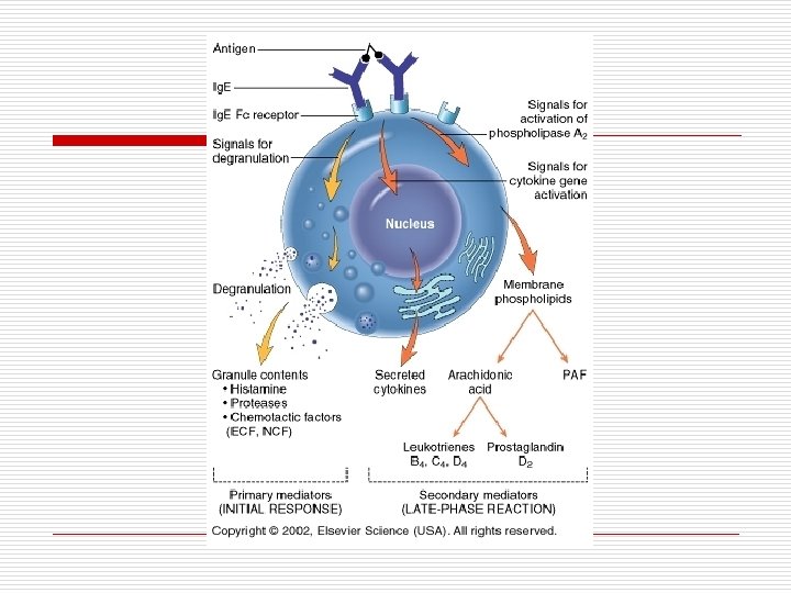 Mediator Wynik działania Histamina obkurczenie mięśni gładkich oskrzeli obrzęk błony śluzowej oskrzeli zwiększenie wydzielania śluzu pobudzenie mięśni gładkich przewodu pokarmowego (wymioty) zmiany skórne (pokrzywka) rozszerzenie naczyń krwionośnych Leukotrieny PAF (platelet activating factor) ECF-A (eosinophil chemotactic factor of anaphylaxis) Prostaglandyny bardzo silne obkurczenie mięśni gładkich oskrzeli obrzęk błony śluzowej oskrzeli zwiększenie wydzielania śluzu rozszerzenie naczyń krwionośnych zwiększenie przepuszczalności naczyń obkurczenie mięśni gładkich oskrzeli zwiększenie napływania eozynofilów nasilenie uwalniania mediatorów zapalnych nasilenie skurczu mięśni gładkich oskrzeli zwiększenie przepuszczalności naczyń www. nexter. pl/al_wspolcz/art_lf. php? art=0007