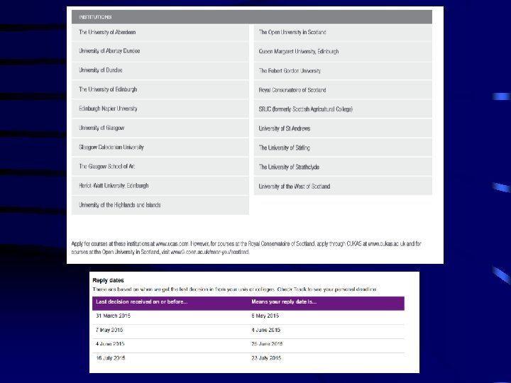 UCAS • Universities’ and Colleges’ Admissions Service • Established central role in UK admissions providing a wide -ranging, impartial service to schools, applicants and HEIs • Does not include most colleges in Scotland • Also now deals with applications to the Royal Conservatoire of Scotland other conservatoires • www. ucas. com
