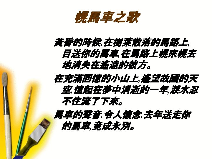 Writing and Différance Two chains of signification: 2. Re-contextualization; traces kept. e. g. 1. Pharmakon: 1). poison, 2). Pharmacy 2. Creole: 1). Native, local, ”pure”; 2). Native-born whites; 3). Hybrid 3. 《悲情城市》中的 〈幌馬車之歌〉; 《好男好女 》 ︰ 1937 蔣碧玉認識鍾浩東� 1940 赴大陸. -1949 被捕� -1950 年十月十四日鍾浩東被 殺� 臨刑前〈幌馬車之歌〉響起.