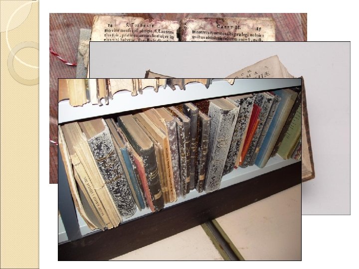 Oštećenja na knjigama: - Strukturalna (deformacija korica, boranje i sljepljivanje listova) - Otapanje pigmenata i tinte kojom je knjiga pisana te razlivanje i otapanje vrijednih pečata u knjizi - Mikrobiološka (razvoj bakterija i plijesni) - Vrijeme izloženosti vodi proporcionalno je stupnju oštećenja – brza reakcija je ključna