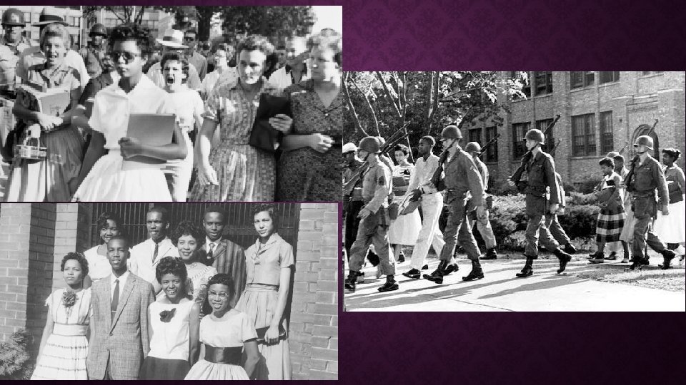 • Little Rock, Arkansas, 1957 • 9 black children admitted to a white high school • Governor used National Guard to block them from entering the school • Eisenhower pressured the governor to allow them to go to school – but they weren’t protected • “Little Rock Nine” • Eisenhower sent federal troops to protect the black students