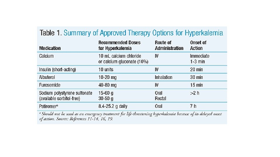 • 5 - Diuretics : In patients with adequate kidney function, loop diuretics (e. g. , furosemide and bumetanide) in combination with thiazide diuretics can be used for the excretion of potassium. Onset of action is 15 to 60 minutes. However, it should be noted that although diuretic-induced volume depletion can lead to decreased distal nephron flow and reduced potassium excretion, volume-expanded patients will benefit from diuresis. • 6 - kayexalate or SPS is a cation-exchange polymer that exchanges sodium for potassium, in addition to other cations such as calcium, ammonium, and magnesium. SPS also contains a considerable amount of sodium content and should be used cautiously in patients with concomitant conditions such as congestive heart failure, edema, and severe hypertension.