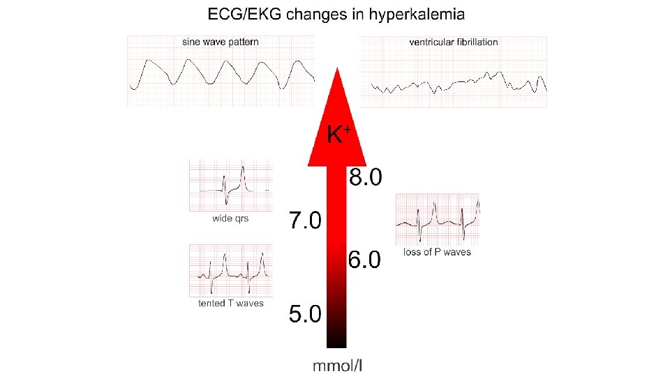 4 -Development of a sine wave pattern • As K+ levels rise further, the situation is becoming critical. The combination of broadening QRS complexes and tall T waves produces a sine wave pattern on the ECG readout. Cardiovascular collapse and death are imminent.