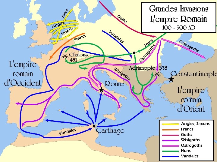 A přišli Gótové! § V sedmdesátých letech 4. století vpadli do východní Evropy Hunové, podrobili si Alany a zničili říši gótských Greutungů § Pod jejich tlakem jiná skupina Gótů, kterou dnes nazýváme Tervingové, požádala císaře Valense o povolení překročit Dunaj a usadit se v římské provincii Moesii § Imperátor potřeboval nové rekruty pro svá vojska, a proto přijal požadavky barbarů
