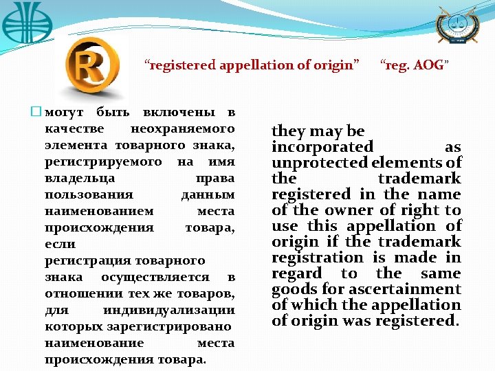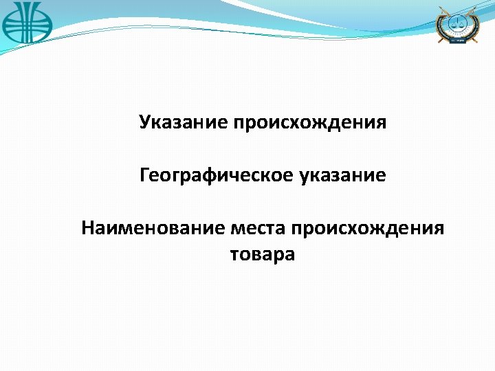 �Geographical Indication �Appellation of origin of good � an indication identifying goods � a designation which constitutes or contains the name of the country, that originate in the certain region, population center, area or territory, region or area any other geographical indication as well as any indication derivative of such name and became famous as a result of using it in relation to the good which special characteristics, quality, reputation or other characteristics are connected with its geographical origin including the specific environmental conditions and (or) human factor
