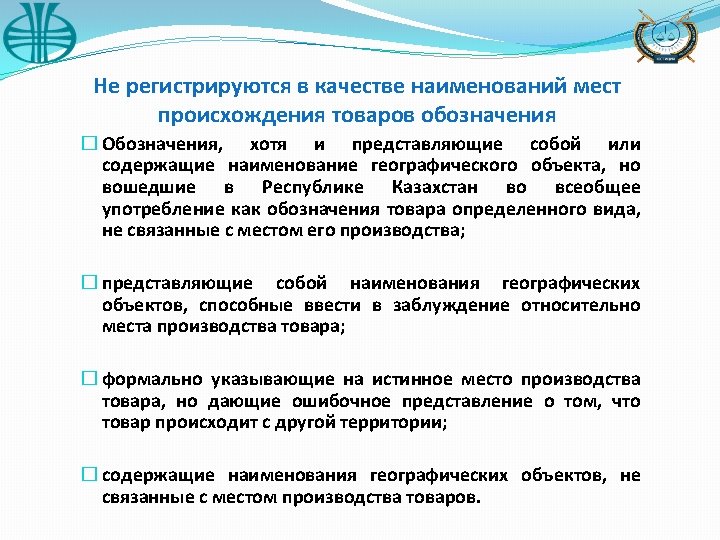 The designations may not be registered as appellations of origin if they � The designations which are or contain the name of geographical location but entered in the Republic of Kazakhstan into common use as designations of the specific kind of good not related to the place of its production; � are names of the geographical locations that may mislead as of the place of production of the good; � formally indicate the real place of production of the good but give the false impression that the good originates from another territory; � contain the names of geographical locations not related to the place of production of the good.