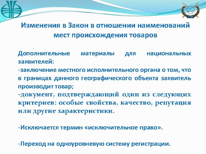 Changes to the Law in regard to appellations of origin Additional materials for national applicants: -the opinion of the local executive authority that the applicant produces the good; -document certifying one of the following criteria: special properties, quality, reputation or other characteristics related to the place of origin Excluded «exclusive right» . One-level system of registration objects of industrial properties.
