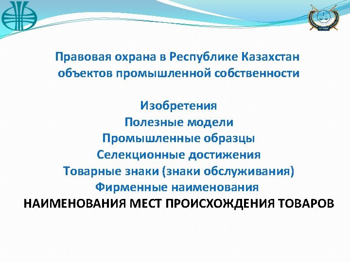 Legal protection of objects of industrial property in Kazakhstan Inventions Utility models Industrial designs Selection achievemnts Trademarks (service marks) Trade names APPELLATIONS OF ORIGIN OF GOODS