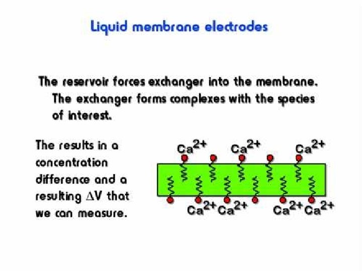Liquid Membrane Electrodes • Potential develops across the interface between the analyte solution and a liquid ion exchanger (that bonds with analyte) • Similar to a p. H electrode except that the membrane is an organic polymer saturated with a liquid ion exchanger • Used for polyvalent ions as well as some anions • Example: • Calcium dialkyl phosphate insoluble in water, but binds Ca 2+ strongly