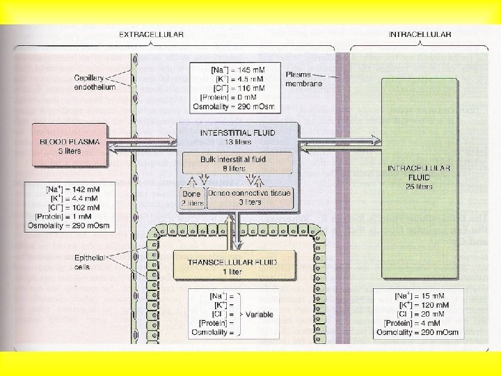 COMPARTIMENTI LIQUIDI DELL’ORGANISMO Acqua 60% Intracellulare 60% (25 l) Extracellulare (15 l; comprende il plasma – 3. 5 l) Transcellulare (membrane speciali: articolazioni, occhio …)