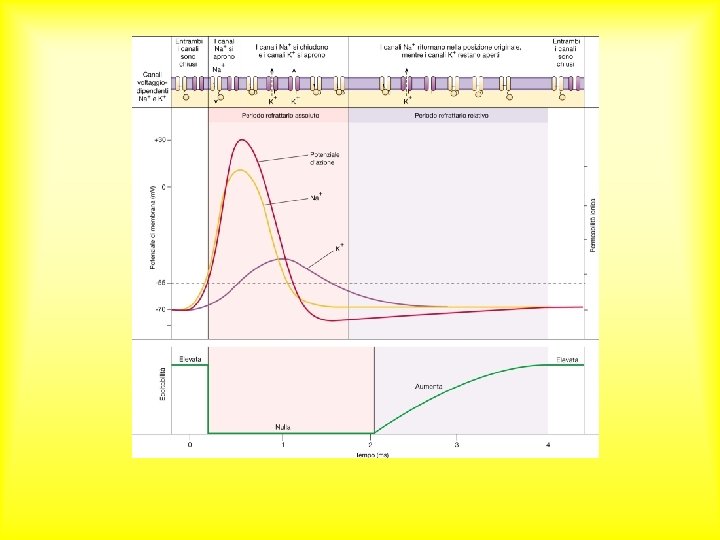 I canali Na+ voltaggio dipendenti possono trovarsi in tre diverse condizioni: 1. Attivi ma chiusi (a riposo, polarizzazione) 2. Aperti (spike) 3. Inattivi (apice dello spike; periodo refrattario assoluto)