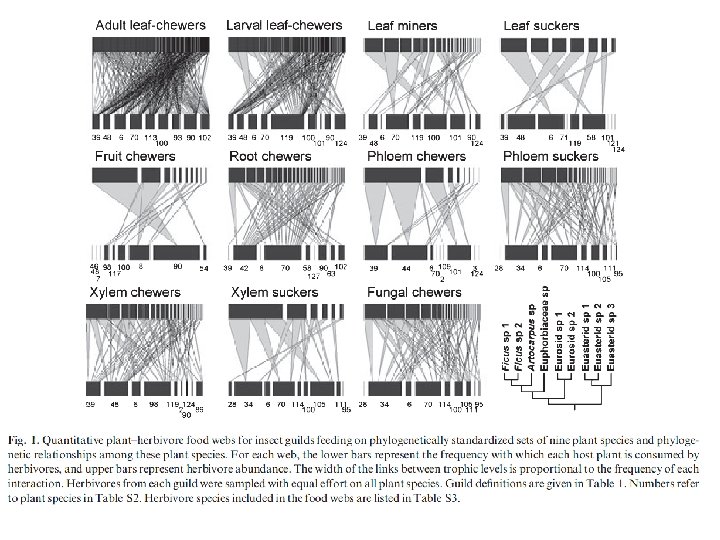 Potravní vztahy propojují druhy na téže trofické úrovni do jednoho dynamického systému Každý bod představuje minující druh. Spojnice mezi nimi představuje sdílený druh parazitoida. Minující druhy jsou funkčně propojeny sdílenými parazitoidy, neboť jejich měnící se početnost i preference pro různé hostitele propojuje i populační dynamiku těchto hostitelů.