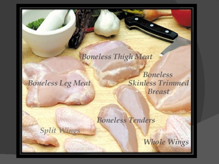 Processing Steps (continued) Cut-up and deboning On average, 75 -80% of the live animal weight is retained in the carcass. This amount of live weight retained in the carcass is known as the dressing percentage or yield. The carcass can be sold whole, or individual components of carcass can be cut-up for individual sale. Cut-up often times includes removal of the breast, thigh, drumsticks, and wings. Deboning refers to the removal of bone from the cut-up meat. Breasts and thighs are commonly deboned.