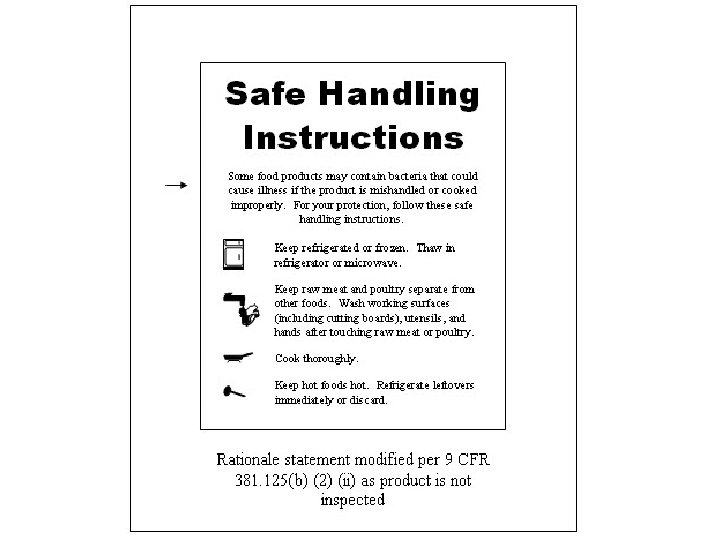 Basic Sanitary Standards • Following are general basic sanitary standards, practices, and procedures [9 CFR 416. 2 -416. 5]. The list is a summary of the regulatory requirements for sanitation procedures and practices that are required for a poultry business receiving full U. S. Department of Agriculture inspection and are applicable to poultry exempt operations {Title 9 CFR Part 416}. A. Sanitary operating conditions. All food-contact surfaces and non-foodcontact surfaces of an exempt facility are cleaned and sanitized as frequently as necessary to prevent the creation of insanitary conditions and the adulteration of product. Cleaning compounds, sanitizing agents, processing aids, and other chemicals used by an exempt facility are safe and effective under the conditions of use. Such chemicals are used, handled, and stored in a manner that will not adulterate product or create insanitary conditions. Documentation substantiating the safety of a chemical's use in a food processing environment are available to inspection program employees for review. Product is protected from adulteration during processing, handling, storage, loading, and unloading and during transportation from official establishments. 7