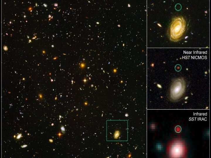 HUDF-JD 2, galaxie primordiale mise en évidence dans le cercle situé sur les trois agrandissements à droite de l'image. Son décalage vers le rouge est d'environ z=6, 5, donnant un temps de regard vers le passé de 850 millions d'années après le Big Bang