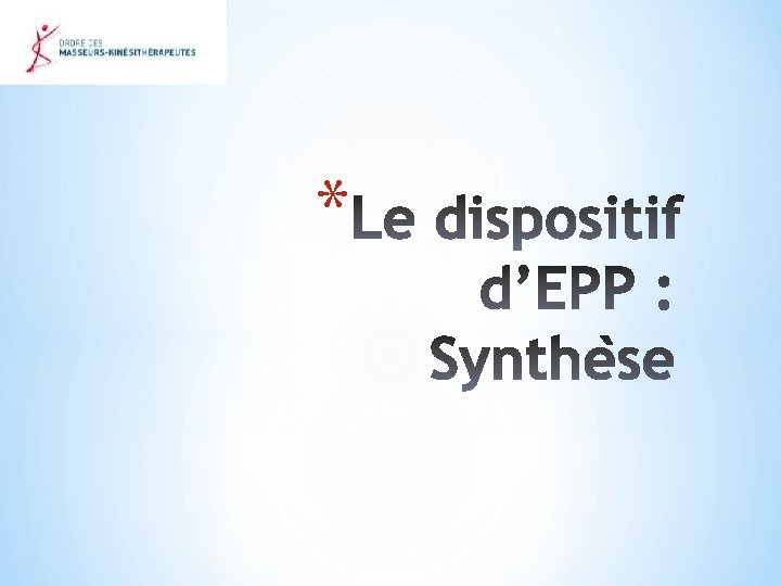 * *Utilisation de ce power point, du film 1 et des 2 questionnaires par les CDOMK, les C(I)ROMK et les MK pour s’initier à l’EPP. *Quelquefois les MK considèreront que la conformité proposée est mauvaise et cela est normal par rapport à leurs expériences.