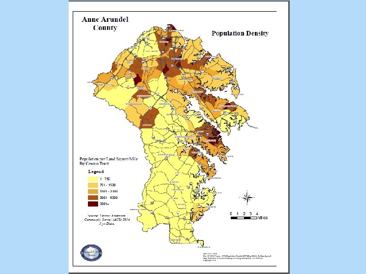 The State of the County Anne Arundel County population is 556, 348; a growth of 11. 2% since 2000 Senior population (over 65) increasing from 99, 086 (2013) to 140, 000 by 2030 The Hispanic population is now at 6. 4% or 34, 854 residents. There are 33, 352 residents (6. 3%) living below poverty, a slight dip from 2011 Anne Arundel County is one of most expensive places to live in the state The gap between rich and poor has widened since 2010. The majority of negative social/ health indicators polarized Northern and South All of our rivers are “impaired” under the Clean Water Act Anne Arundel was given an F by the American Lung Association for an average of 23 unhealthy, high ozone days every year between 2011 and 2013.