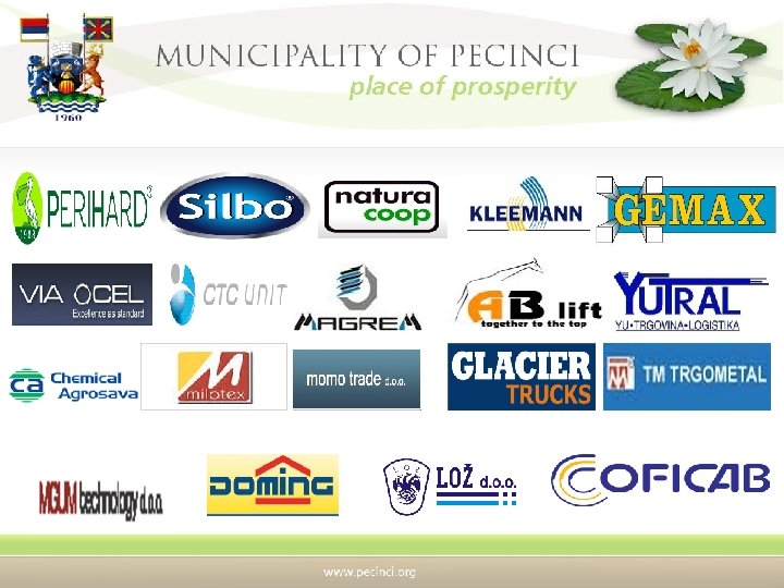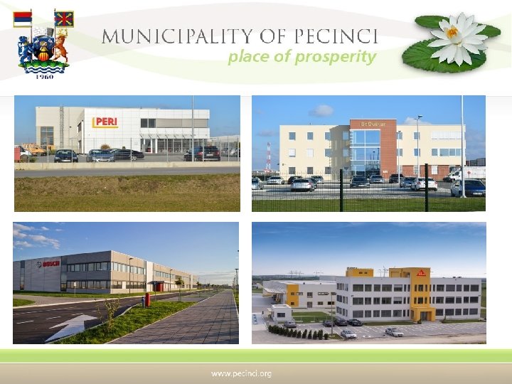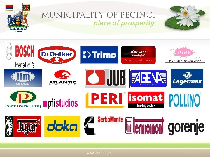 Opština Pećinci - Najznačajnije investicije • Realizovane investicije iz više zemalja Evrope i sveta među kojima su investicije iz: Nemačke, Slovenije, Austrije, Grčke, Velike Britanije, Izraela, Tunisa. • Najznačajniji investitori: BOSCH, Dr Oetker, Don. Cafe, PFI Studios, PERI, SIKA, Doka, Trimo, JUB Boje, Agena Tch, Kleemann Lifts, Lagermax AED, Isomat, Tira, Coficab, Silbo, VOX, Chemical Agrosava, Atlantic Group, WBM, IM Đurđević, Lodis Logistika, Mini Pani, Phoenix, Pollino Plast, Sunoko, NAVAK. . .
