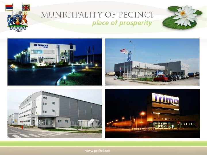 Zašto investirati u Pećince: • Veliki prostorni potencijal za priliv novih investicija - 1800 ha radnih zona • Institucionalna podrška za investitore: Opštinski uslužni centar, Odeljenje za privredu, LER, Agencija za razvoj opštine Pećinci • Efikasna lokalna administracija • Konkurentne cene- niski doprinosi za uređenje građ. zemljišta, komunalne i lokalne takse • Usvojena plansko-tehnička dokumentacija: Prostorni Plan opštine Pećinci, Plan generalne regulacije i Plan detaljne regulacije radnih zona