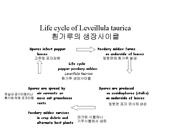 Development 감염 • • • Infection can occur over a wide T° range (19 -33°C) 감염은 광범위한 온도범위에서 이루짐(19 -33°C) With changeable humidity 습도변화가 심할 때 Fungus grows in the stomata 곰팡이는 기공을 통해 침입 Production of spores on numerous, fine strands of stalks = white patches or mildew colonies 많은 량의 포자발생, 가는 균사 = 감염패치 또는 흰가루 다발 Air currents carry the spores to other leaves 공기이동에 의해 포자 다른 잎으로 전이 Can spread out also by workers clothing 작업자에 의해 전이가능