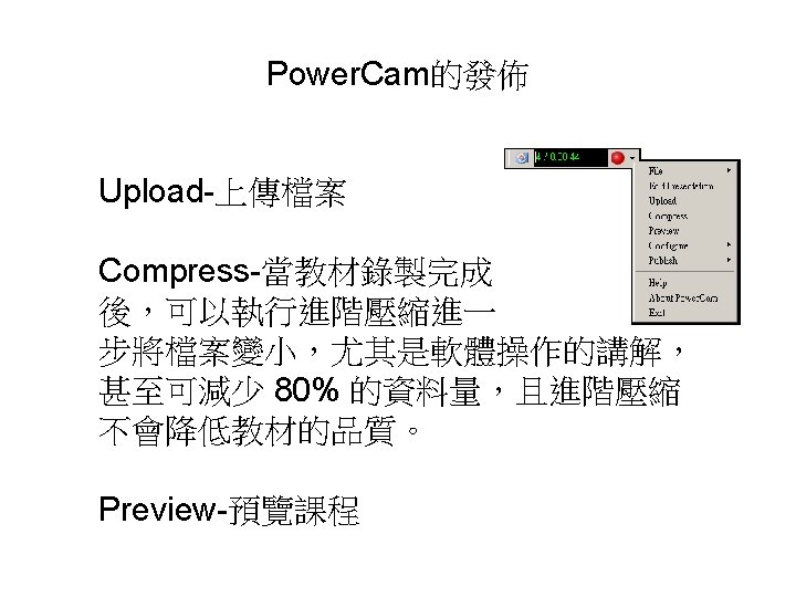 Power Cam Power Cam File 1 Fileopennew project Slides: 13 Download presentation Power. Cam教學 Power. Cam的設定 File • 1. File/open/new project開啟或新增專案 • 2. File/Save Project as另存新檔 • 3. File/Abstract-專案摘要 Power. Cam的設定 Configure • 1. Configure/General-基本設定 Power. Cam的設定 Configure • 2. Configure/Web Template-網頁套版 Power. Cam的設定 Configure • 3. Configure/Mic Volume-音量設定 • 4. Configure/Background Music背景音樂 Power. Cam的錄製 Power. Cam的編輯 Edit Presentation Power. Cam的編輯 Edit Presentation 1. Edit Title-修改段落的標題(預設值是 topic 1…) 2. Move Down/Up-移動段落的順序 3. Delete-刪除段落 4. Insert Video-插入影片 5. Split Topic-分割段落 6. Merge with Next Topic-合併下一個 段落 7. Import Topics-輸入 8. Export Topics-匯出