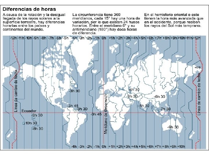 LOS HUSOS HORARIOS MERIDIANOS = 360 DIA = 24 HORAS 360º : 24 horas = 15º HORAS GRADOS 1 hora = 15º 4 minutos = 1º