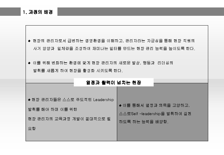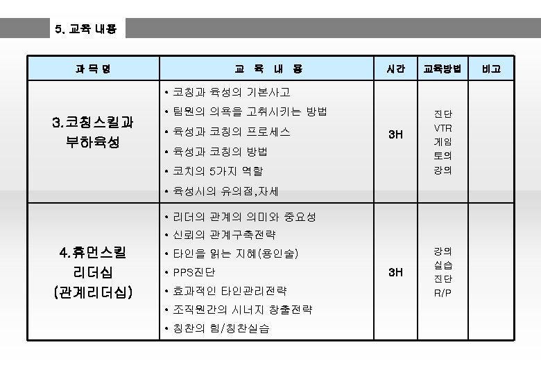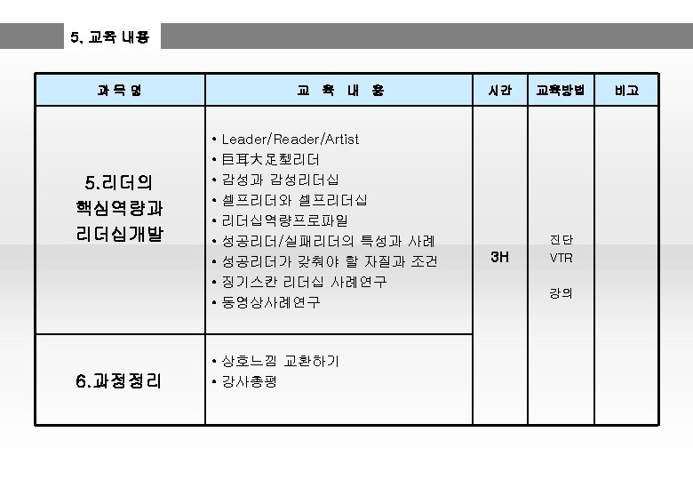 POWER POINT TEMPLATE Company's new low-cost and easy-to-use Web-site design tool will help entrepreneurs spiff up their online. 4. 과정의 구성 내용 시간 Module 모 듈 내 용 (강의주제) Module 1 환경변화와 현장관리자의 역할 3 Module 2 재미나는 일터 만들기 3 Module 3 코칭 스킬과 부하육성 3 Module 4 휴먼스킬 리더십(관계리더십) 3 Module 4 리더의 핵심역량과 리더십 3