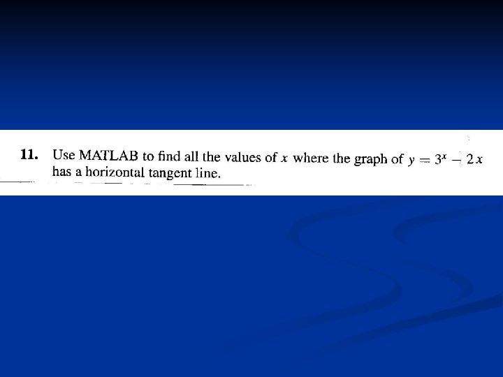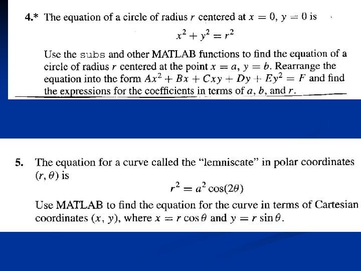 When more than one variable occurs in the expression, MATLAB assumes that the variable closest to x in the alphabet is the variable to be found. You can specify the solution variable using the syntax solve(E, ’v’), where v is the solution variable. More? See pages 596 -598. 10 -23