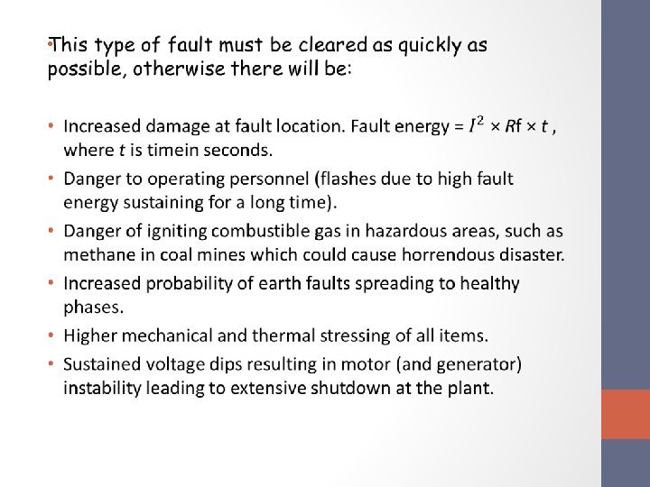 • Overloading leading to over heating of insulation (deteriorating quality, reduced life and ultimate failure). • Overvoltage: Stressing the insulation beyond its withstand capacities. • Under frequency: Causing plant to behave incorrectly. • Power swings: Generators going out-ofstep or out-of-synchronism with each other.