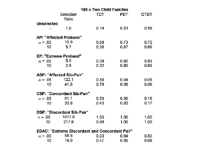 Selection Strategies • Selection based on one tail – Affected Proband, Affected Pairs • Selection from either tail – Extreme Proband – Concordant Pairs – Discordant and Concordant