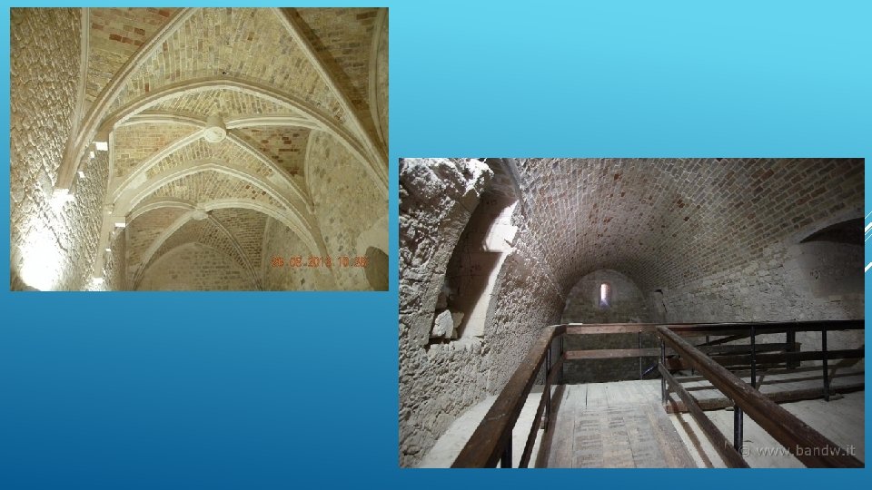 TORRE CABRERA STRUTTURA Durante i restauri cinquecenteschi venne deciso di asportare la scala a chiocciola, in favore di una più solida scala lapidea divisa in due rampe. Alla sala di sud-est del primo piano si giunge per mezzo di due porte, delle quali una ad ogiva con chiave di volta impreziosita dallo stemma dei Cabrera. Anche questo ambiente offre la consueta suddivisione in tre campate, la centrale rettangolare e le laterali a pianta quadrata, coperte da crociere costolonate. Si rileva anche la presenza di alcune finestre, databili, presumibilmente, ad epoca dsc 01830 cinquecentesca. La seconda elevazione offre una divisione identica rispetto al piano inferiore. Anche in questo caso si possono osservare due ampie stanze tripartite e sorrette da crociere, giunte fino ad oggi nella loro originaria integrità.