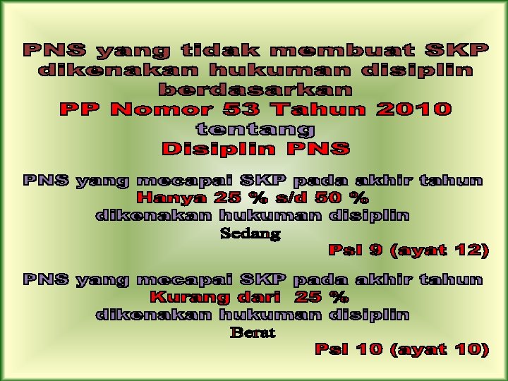 Peraturan Pemerintah No. 10 Thn 1979, tentang Penilaian Pelaksanaan Pekerjaan PNS (DP-3) 8 Unsur dan 222 Sub Unsur ● kesetiaan (17 SU) ● prestasi kerja (35 SU) ● tanggung jawab (30 SU) ● ketaatan (25 SU) ● kejujuran (15 SU) ● kerja sama (30 DENGAN BERLAKUNYA PP 46 Th 2011 dan PERKA BKN NO 1 Th 2013 maka PP NO 10 THN 1979 SE BKN No. 02 Th 1980 DINYATAKAN TIDAK BERLAKU LAGI