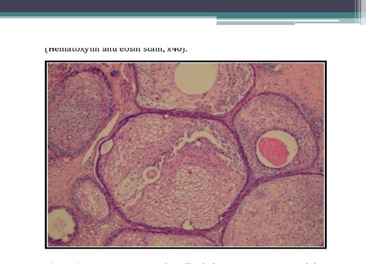 • Mikroskopicky: • dobře ohraničená hnízda s vrstevnatým dlaždicovým epitelem a tubuly vystlané jednou až dvěma řady kubických buněk, nebo dlaždicovými buňkami. V centru hnízd může byť přítomná nekróza s kalcifikací, nebo keratinové perly.