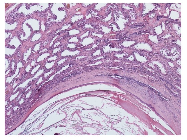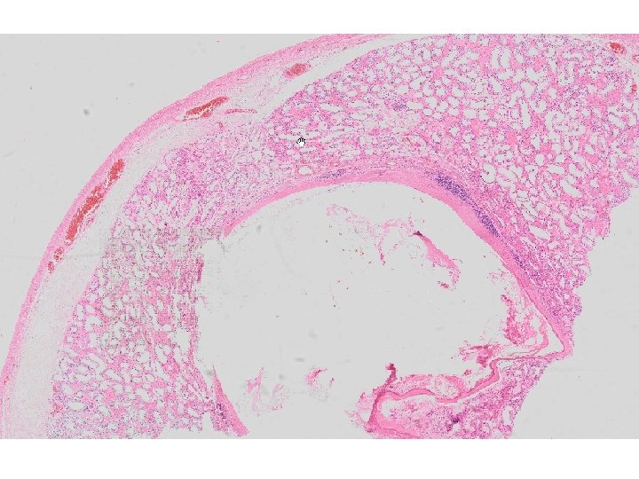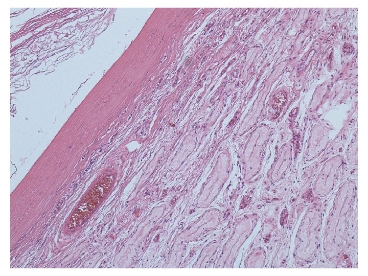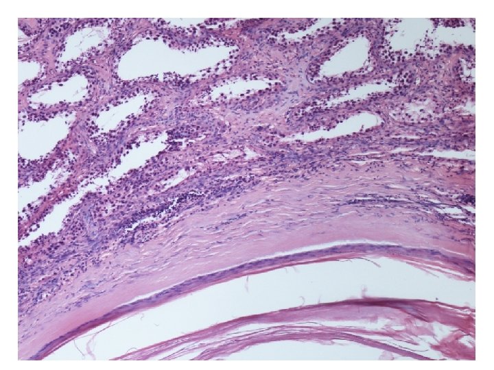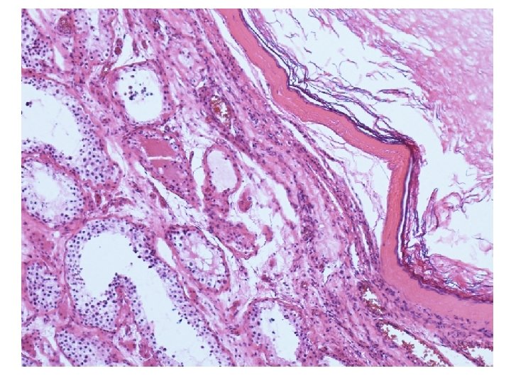 Mikroskopické vyšetření • tkáň varlete se stěnou cysty tvořenou různě silným hyalinizovaným vazivem s různě intenzivní kulatobuněčnou zánětlivou celulizací, která je ložiskově vystlaná zachovalým rohovějícím vrstevnatým dlaždicovým epitelem • v lumen cystického útvaru keratinové hmoty • v okolí cystického útvaru atrofické a hyalinizované semenotvorné kanálky