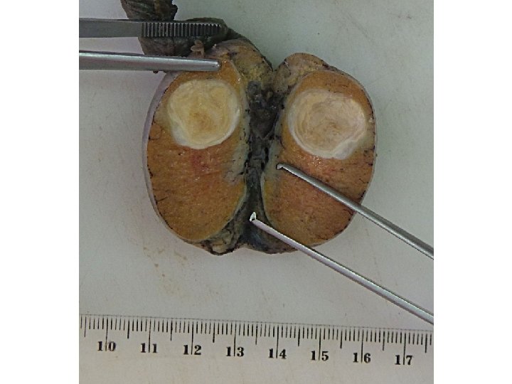 Makroskopické vyšetření • dodán materiál RAOE l. sin. • varle velikosti 48 x 27 mm • v horním pólu ohraničené bělavobéžové ložisko velikosti 18 x 16 x 15 mm, tvořené fokálně se oddrolujícími béžovými poloměkkými hmotami • ložisko bylo zablokováno celé