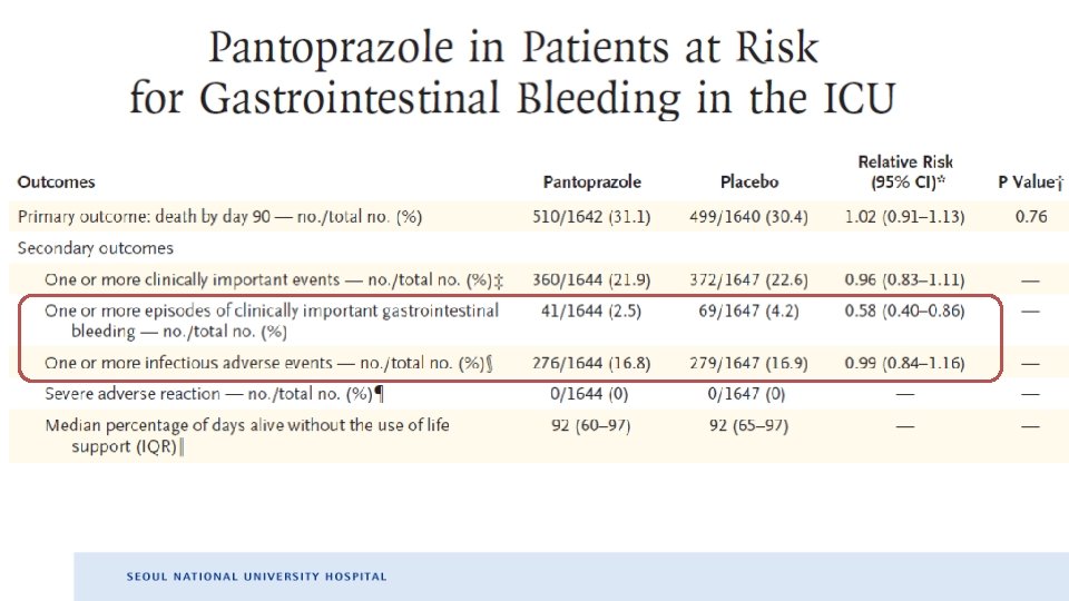 Summary: NEJM • Participants with at least one risk factor for CIGIB – Stayed in the ICU for a median of 6 days – Received trial agent for a median of 4 days • No significant differences in 90 -day mortality and clinically important adverse event • Low incidence rate of CIGIB in PPI group (2. 5% vs. 4. 2%)