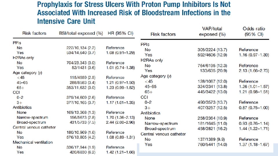 Prophylaxis for critically ill patients: possible harms • May predispose patients to nosocomial infections – Increased risk of in pneumonia • PPI vs. H 2 RA, OR 1. 19 (95% CI 1. 03 -1. 38) – C. difficile infection Bateman BT et al. BMJ 2013; 347: f 5416. Buendgens L et al. J Crit Care 2014; 29: 696. e 11 -e 15 • Use of PPI (OR 3. 1, 95% CI 1. 1 -8. 7) • Long duration of exposure to PPI (OR 2. 0 95% CI 1. 2 -3. 4) • Use of antimicrobial agents (OR 2. 5, 95% CI 1. 2 -5. 2) Barletta JF et al. Crit Care 2014; 18: 714.