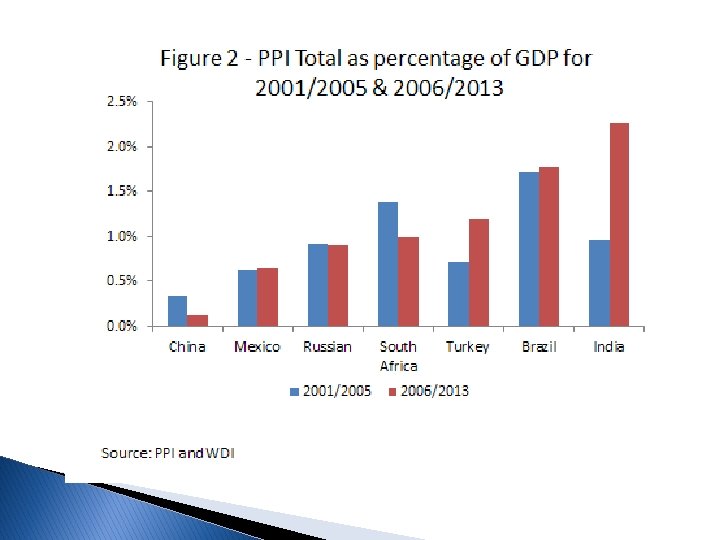 1. Past experiences with PPPs Since 1990 s, China has attracted US$150 billion of PPP projects in transport, energy, water and sanitation, and telecoms. However, China has a relatively low percentage of PPI in overall infrastructure investment and as a proportion of GDP. 5
