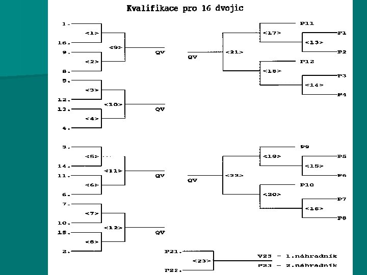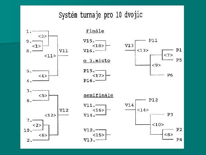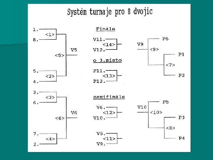 Vylučovací systém na dvě porážky Je obtížnější a časově náročnější, ale poněkud objektivnější než předchozí. Při tomto systému je družstvo vyloučenou po dvou porážkách. To vyžaduje přípravu dvou tabulek (tzv. pavouků): jednu pro skupinu vítězů, druhou pro skupinu poražených. n Celkový počet utkání se stanoví podle vzorce 2 n – 3, přičemž n znamená počet zúčastněných družstev. n Tímto systémem je možno objektivně určit prvá tři družstva soutěže. n