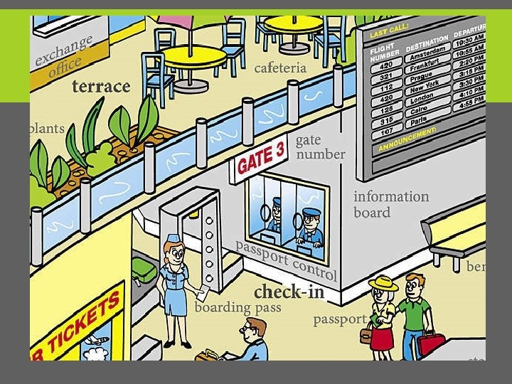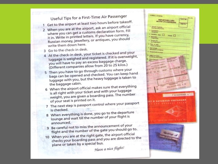 SOME USEFUL EXPRESSIONS - Where’s the information desk, please? - Show me your passport, please! - l’m here on business / vacation – l’m traveling alone / with my family - Anything to declare? – No, there’s nothing to declare / Nothing to declare - You’ve got a lot of baggage! Why don’t you use the baggage cart - How much is a one-way ticket (British usually single) to New York? - If you make a round trip, you go on a journey and return to where you started from. - First class / Business class / Economy class - What time does the plane for…. take off / land?