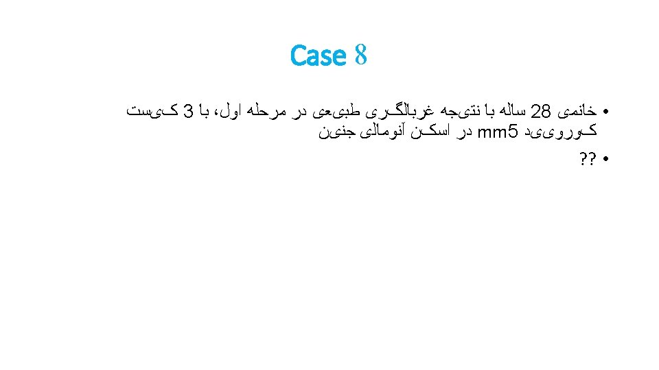 Choroid Plexus Cysts • small cysts (>3 mm) found in the choroid plexus within the lateral cerebral ventricles of the developing fetus at 14 to 24 weeks’ gestation • 50% in fetuses with trisomy 18 • Only 10% of fetuses with trisomy 18 will have CPCs as the only identifiable sonographic marker on ultrasound screening • The number/distribution/size does not change the risk. • the risk when isolated, the likelihood ratio for trisomy 18 is 7 • Isolated, age<35, low risk screening result • Isolated, age>35/positive screening result (18, 21) NO further action! fetal karyotyping (cell-free)