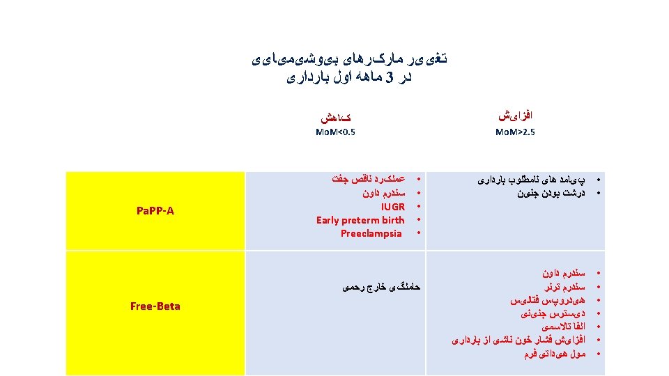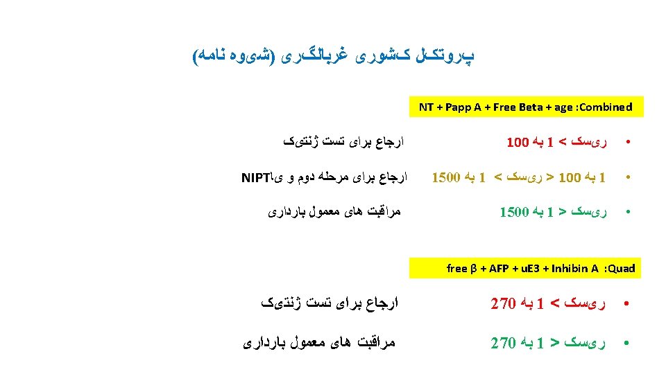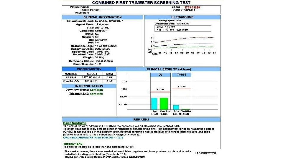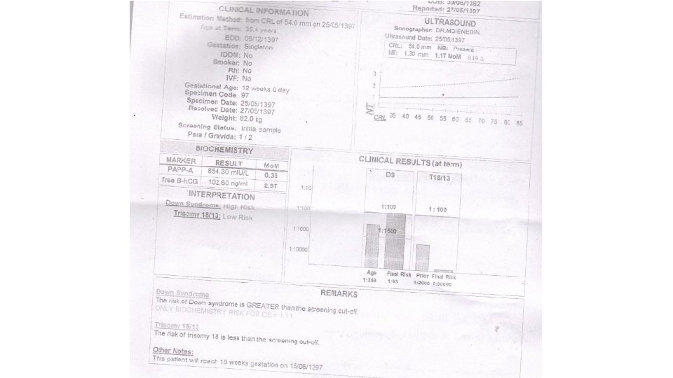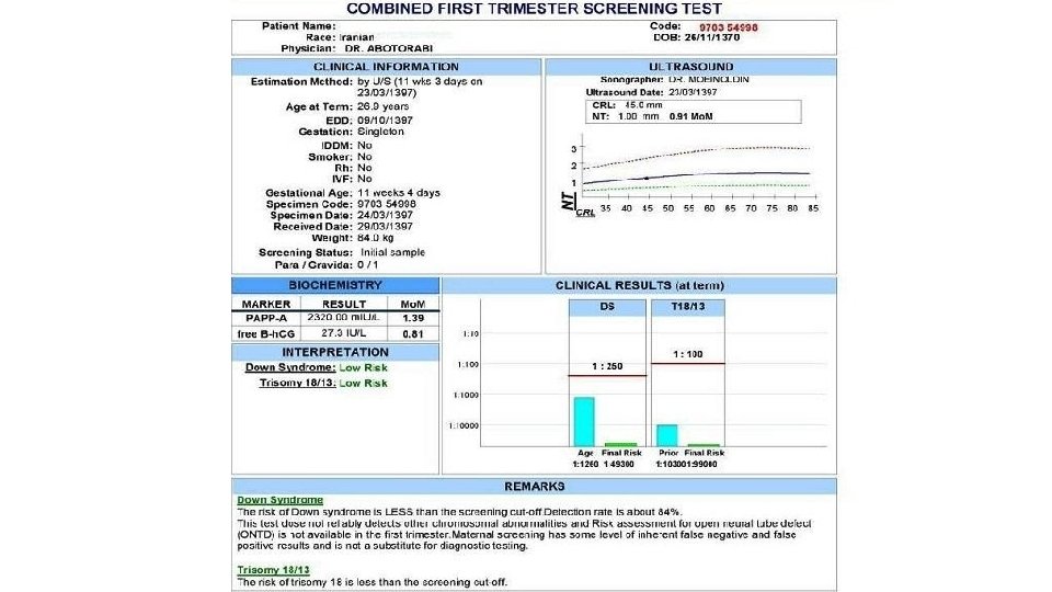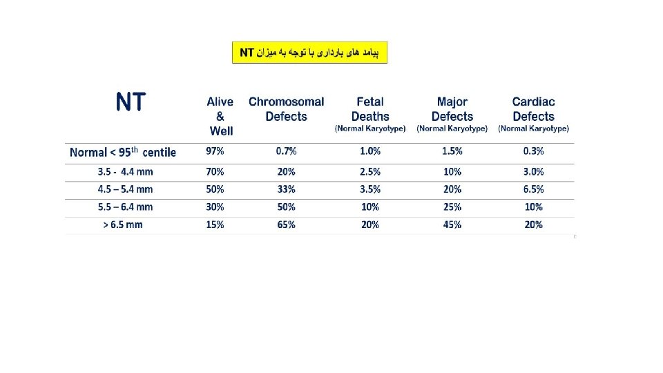 PPV vs. NPV Fetus with Down Syn. Test shows Increased risk 42 Test shows Low risk 8 Total 50 True Positive False Negative Fetus NOT with Down Syn. 1250 23700 24950 False Positive True Negative Total 1292 23708 25000 Sensitivity: 42/50 = 85% (detection rate) 15% of women with a trisomic 21 fetus will be missed by the test Positive Prediction Value: 42/1292 = 3. 25% 96. 75% of women with an increased risk result will NOT have a DS baby Negative Prediction Value: 23700/23708 = 99. 96% of women with a low risk result will NOT have a DS baby