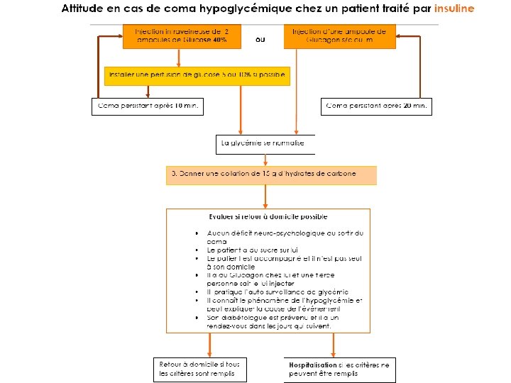 Prise en charge Ø Hospitalisation et mise en condition Ø Insulinothérapie en IV continue: 0. 1 U/Kg/h si G> 2 g/l, puis 0. 05 jusqu’à correction de la cétose et la déshydratation Ø Réhydratation par sérum salé 0. 9% : 20 ml/kg la 1ère heure puis 4 à 14 ml/kg/h (risque d’oedème cérébral) Ø Adjonction de potassium si K+ < 4 à 5 mmol/l puis fonction de l’évolution de la kaliémie Ø Traitement de la cause déclenchante Ø Prévention des complications thromboemboliques