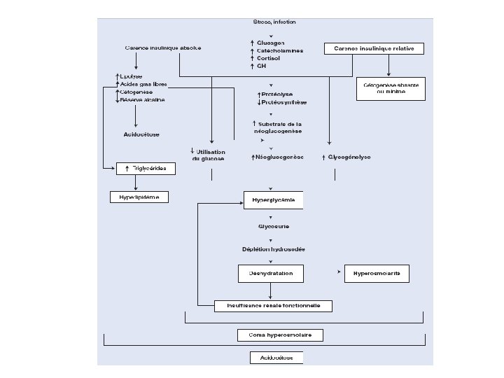 Facteurs déclenchants Ø Carence insulinique absolue: • Acidocétose révélatrice ( 15% ) • Arrêt accidentel ou volontaire +++ de l’insulinothérapie ( 25 % ) • Causes médicamenteuses Ø Carence insulinique relative: • • Infections+++ ( 40%) IDM, causes vasculaires Traumatisme, chirurgie, grossesse Désordres endocriniens : hyperthyroïdie, phéochromocytome, hypercorticisme