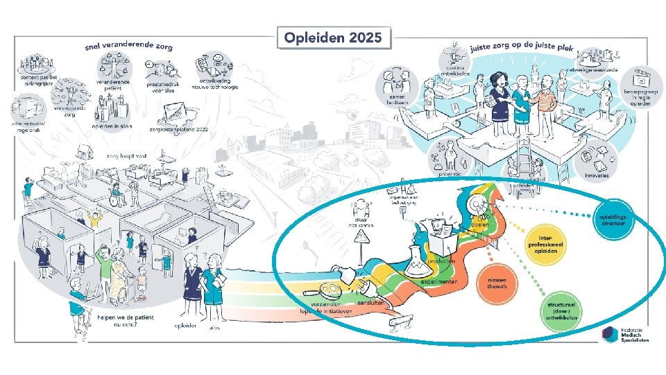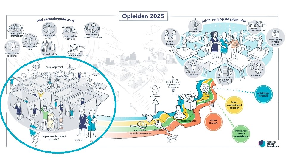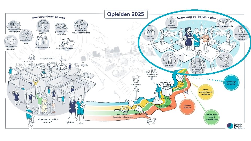Ambitie: Netwerkgeneeskunde I De ambitie van Opleiden 2025 is de beweging van de juiste zorg op de juiste plek door middel van netwerkgeneeskunde vorm geven in de medisch-specialistische vervolgopleidingen. Hierin krijgt het idee vorm dat de specialist in de toekomst met één been buiten het ziekenhuis werkzaam is. Voor de medische vervolgopleiding betekent dit: - De patiënt staat centraal. Een medisch specialist is onderdeel van een netwerk rond de patiënt en kan zijn expertise op het juiste moment ten behoeve van de patiënt inzetten. - De medisch specialisten spelen een belangrijke rol in preventie van ziekte en het behoud van functioneren. - Er wordt interprofessioneel gewerkt en opgeleid. Muren tussen specialismen zijn geslecht, en de verbindingen gelijkvloers.
