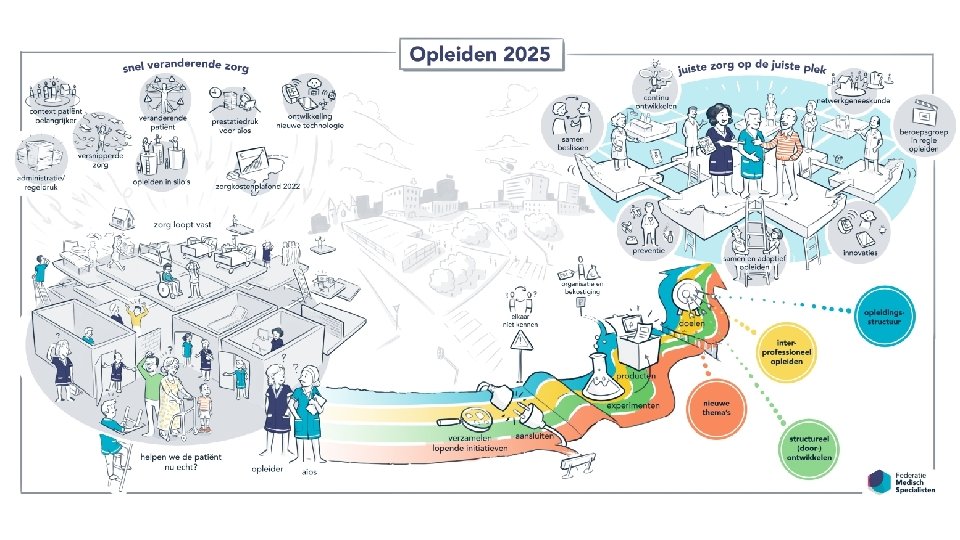 Huidige situatie • In de huidige situatie kunnen we het gevoel hebben dat zorg vast loopt. • Kwalitatief goede zorg staat onder druk van snelle veranderingen in de maatschappij. Nog altijd lukt het onvoldoende om de zorg rondom de patiënt te organiseren. • Deuren van spreekkamers, van de specialist, de huisarts en andere artsen, de verpleegkundig specialist en andere zorgprofessionals staan open, maar de patiënt raakt de weg nog wel eens kwijt. • Er staan ‘muren’ tussen spreekkamers en behandeltrajecten liggen nogal eens buiten elkaars zicht. • Dat laat de patiënt, en zorgprofessional met vragen en frustratie achter. Helpen we de patiënt nu echt? Een aios wordt in deze omgeving opgeleid. • Wat leidt tot de vraag of dit de omgeving is waarin je de competenties van de toekomstige zorg automatisch opdoet. • En dat stelt aios en opleider voor het vraagstuk: Hoe dat wel te doen?