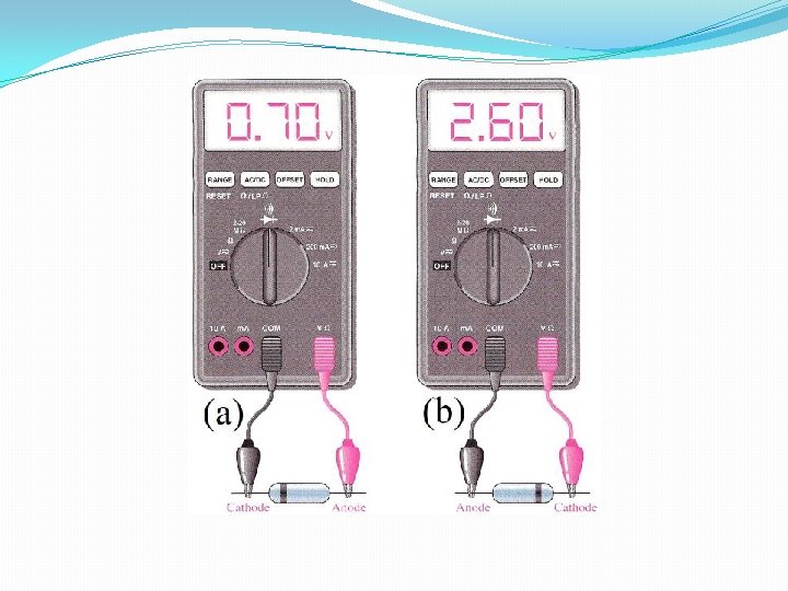 Method 03: Using diode option on multimeter if multimeter shows 0. 7 volt then the terminal of diode which is connected with positive of multimeter is called anode and other terminal will be called cathode as shown in fig(a). if multimeter shows 2. 60 volt then the terminal of diode which is connected with positive of multimeter is called cathode and other terminal will be called anode as shown in fig(b). Fig(a) & Fig(b) Shown in Next Coming Slide